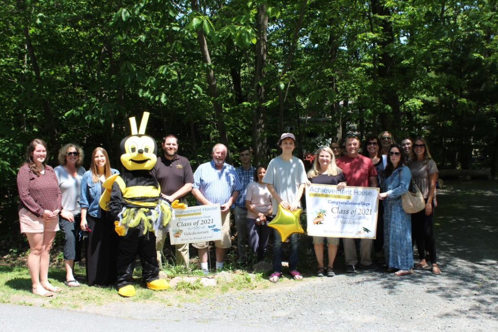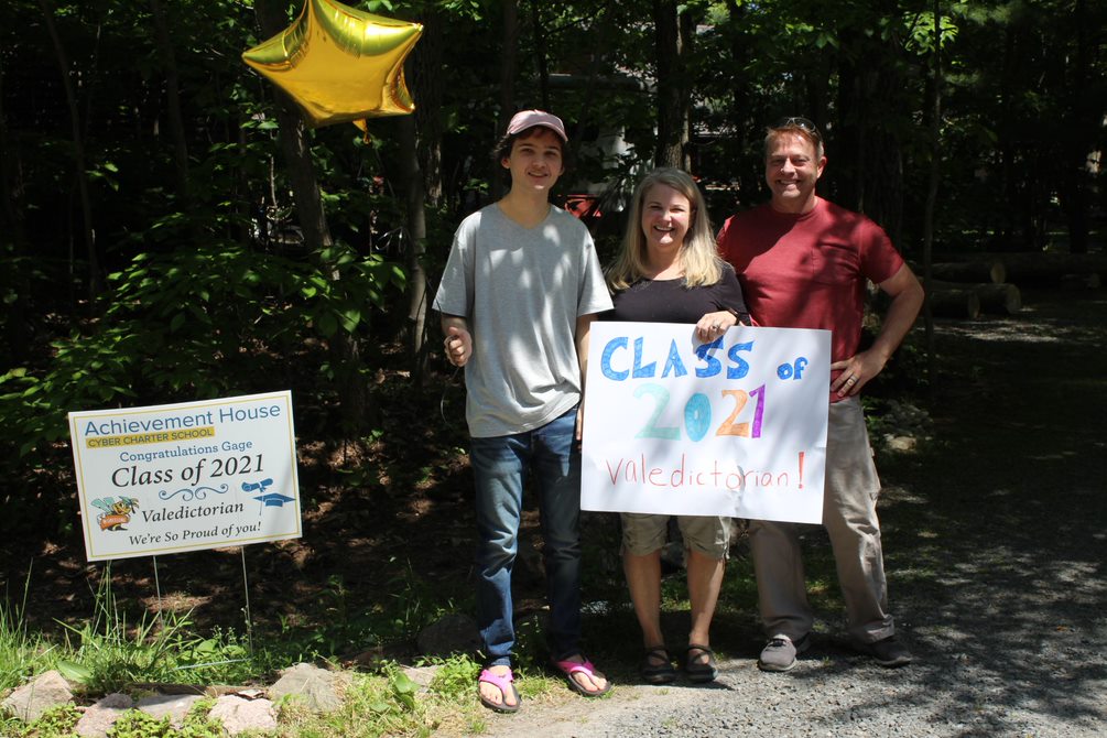 Achievement House Cyber Charter School is proud to honor Gage Sims as Valedictorian of the 2021 graduating class. Gage earned this tremendous achievement by excelling academically due to his years of hard work and passion for education. On Friday, May 21st AHCCS recognized Gage’s accomplishment by taking part in a celebratory surprise drive by to his home. The staff and AHCCS’ very own mascot, Buzzy the Bee, recognized his remarkable academic achievements by presenting Gage with balloons, a lawn sign, and a medal. Staff also decorated their cars with posters and balloons and were able to park to talk and take pictures with Gage and his family.